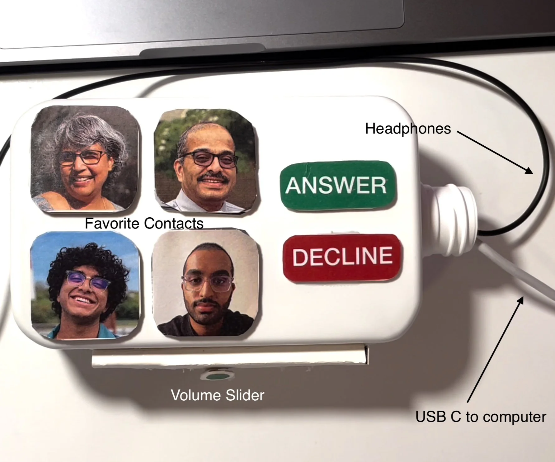 I prototyped a simple switchboard that connects via USB to the iPad or MacBook, and has a headphone jack. The device features basic buttons with faces for the four designated favorites. Finally, it has color coded Answer and Decline buttons alongside a tactile volume slider.