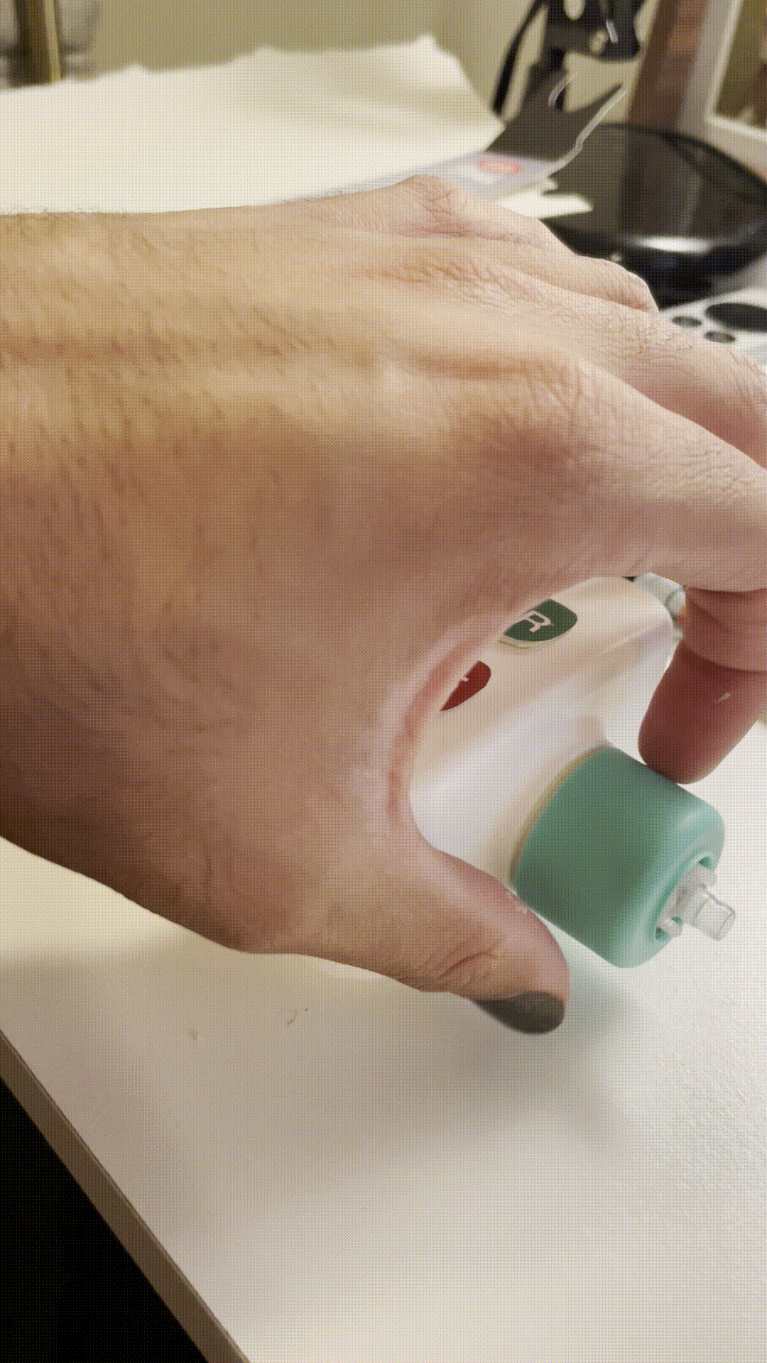 The CeraVe bottle was the perfect size and shape for such a device. The stickers inspired me to make basic buttons with our faces. This first prototype is in a vertical orientation with a knob style volume controller. I figured it would be difficult to pinch and rotate for some people, so I moved onto a horizontal design.